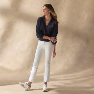 Subtle details make this allover rib sweater so special. with a hand-crocheted yoke and picot trim at V-neckline. Recycled wool/merino wool/cotton/nylon. Hand wash. Imported. Exclusive. Sizes XS (0–2). S (4–6). M (8–10). L (12–14). XL (16–18). XXL (20–22). Approx. 22l.