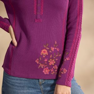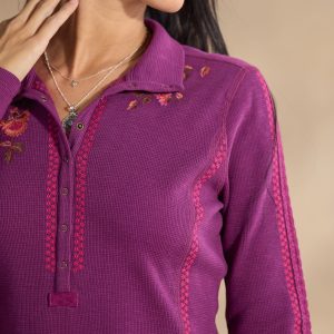 So flattering. our mock neck henley is blooming with stunning. multi colored floral embroidery. feminine lace insets at the sleeves and metal snaps at the placket. Princess seams. Cotton. Machine wash. Imported. Exclusive. Sizes XS (0?C2). S (4?C6). M (8?C10). L (12?C14). XL (16?C18). XXL (20?C22). Approx. 25l.