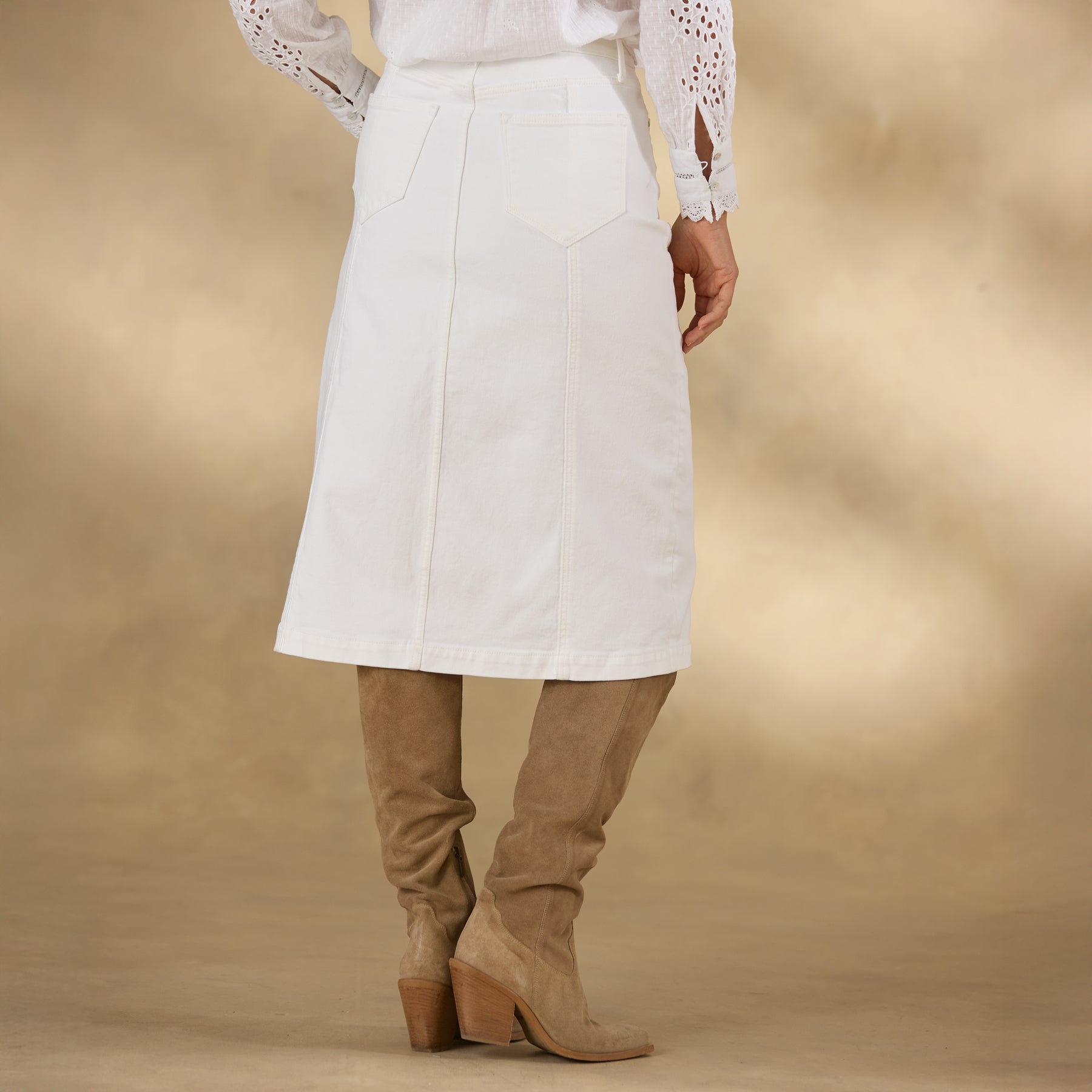 This versatile. knee-length skirt is distressed and features a front slit. two pockets and stitch detailing. Cotton/polyester/spandex. Machine wash. Imported. Exclusive. Sizes 24-34. Approx. 32l.
