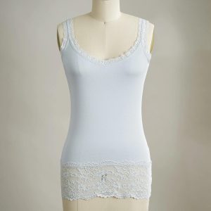 Our essential. lace-trimmed tank is slim-fitting for plenty of versatility. Pair with a sweater or tee for a glimpse of flirty lace. Cotton/spandex. Machine wash. Portugal. Exclusive. Sizes XS (0-2). S (4-6). M (8-10). L (12-14). XL (16-18). XXL (20-22). Approx. 26l.