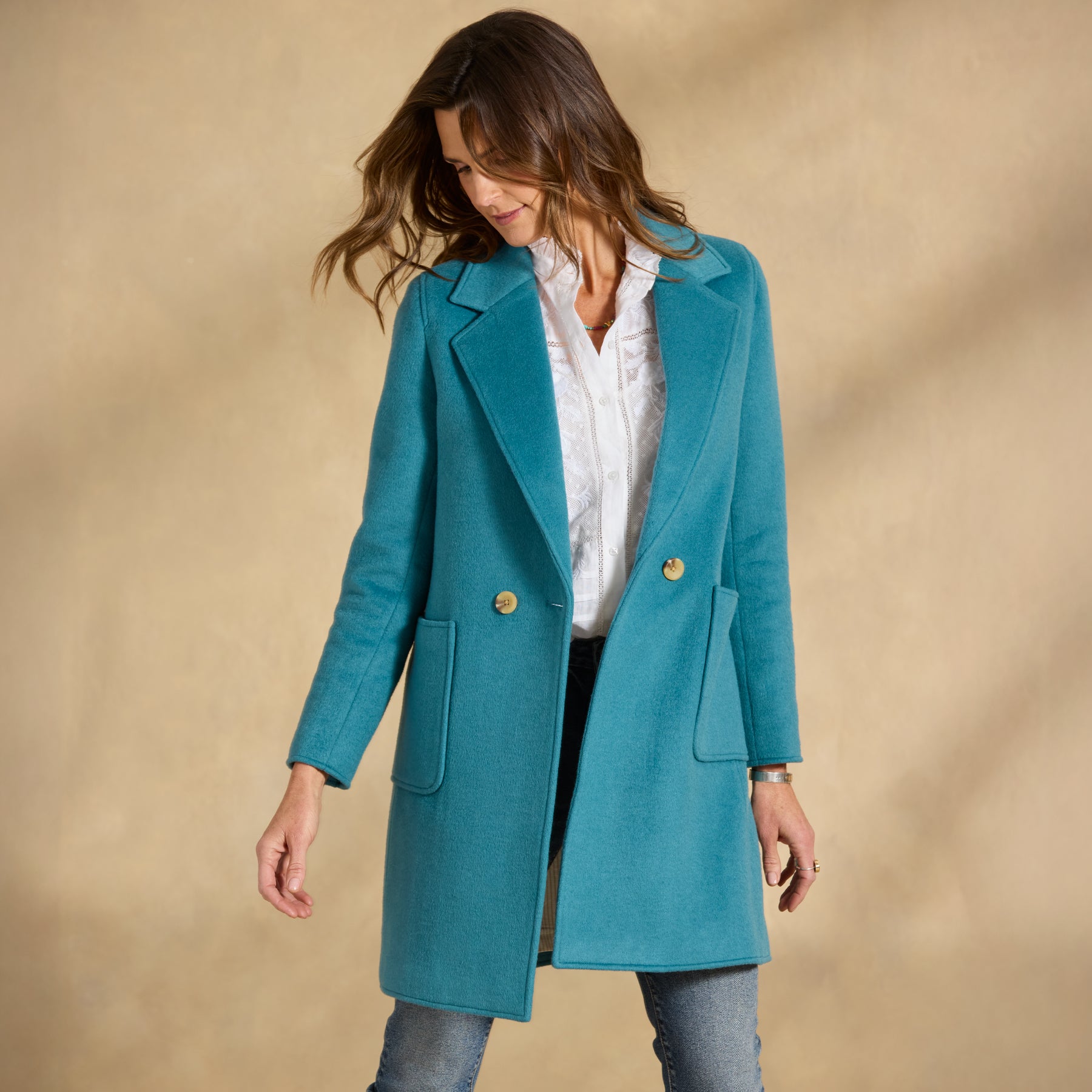 Stylish and bold. our stunning double breasted topper in menswear inspired pinstripes boasts two patch pockets and a contrast print lining. Polyester/wool. Dry clean. Imported. Exclusive. Sizes XS (0?C2). S (4?C6). M (8?C10). L (12?C14). XL (16?C18). XXL (20?C22). Approx. 36l.