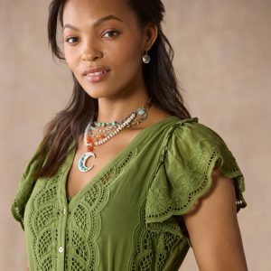 Allover embroidery and soft eyelet tiers add the most feminine touch to our sophisticated V-neck dress with scalloped ruffles at the sleeves. button front placket and a removable belt. Separate slip included. side seam pockets. Cotton. Hand wash. Imported. Exclusive. Sizes XS (0??). S (4??). M (8??0). L (12??4). XL (16??8). XXL (20??2). Approx. 49l.